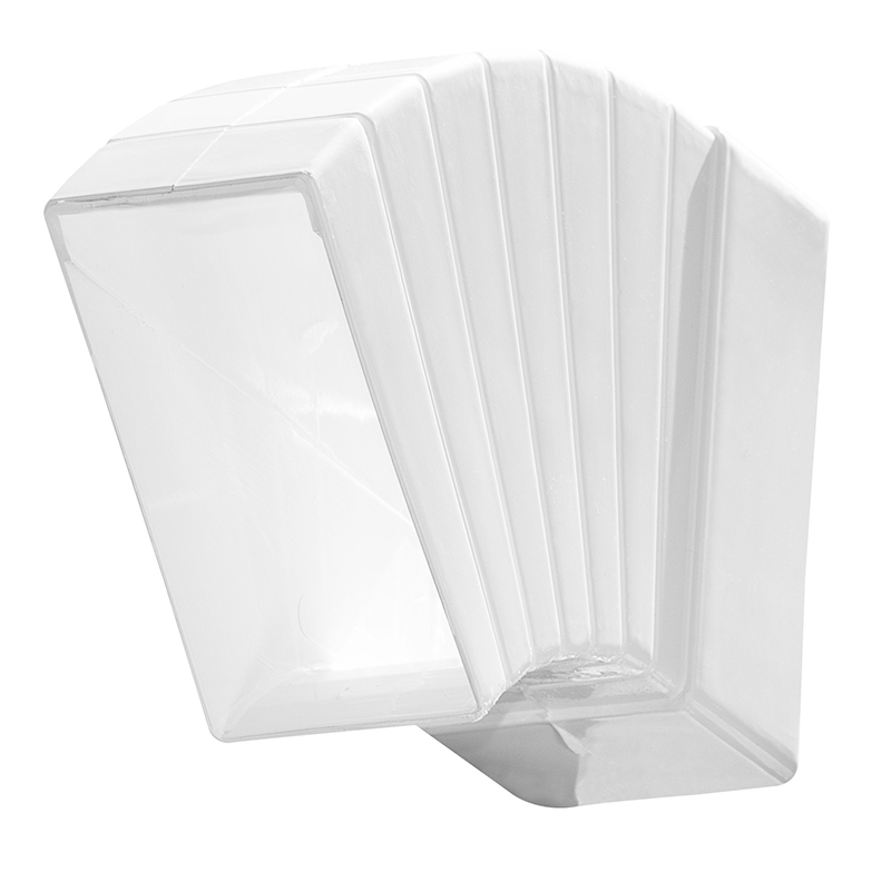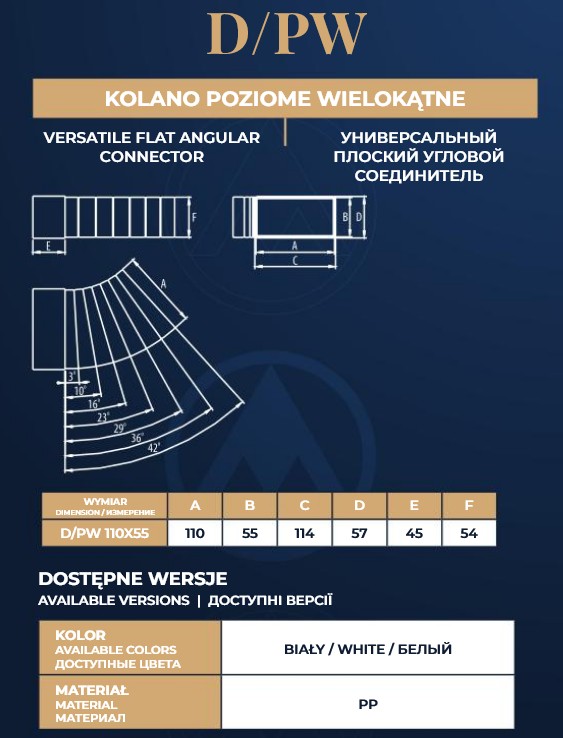 Kolano łącznikowe wielokątne łączy ze sobą płaskie elementy systemu wentylacyjnego pod kątem 3°, 10°, 16°, 23°, 29°, 36° i 42° o wymiarach 110x55mm.