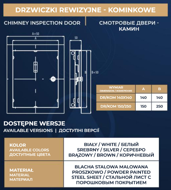 Drzwiczki rewizyjne kominkowe zapewniają szczelność instalacji kominowej oraz gwarantują szybki i łatwy dostęp do komina. Produkt jest trwały i nie traci barwy. Drzwiczki rewizyjne kominkowe cechują się łatwym sposobem montażu. Posłużą przez długie lata. Do wyboru różne warianty kolorystyczne. 50-letnie doświadczenie firmy DOSPEL w produkcji to gwarancja najwyższej jakości.