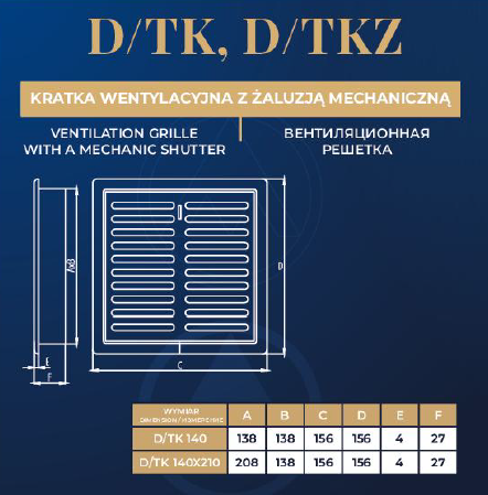 Kratka wentylacyjna z żaluzją mechaniczną pozwala na regulację ciśnienia na całej długości kanału wentylacyjnego. Ten dekoracyjny i estetyczny element wykończenia przewodu wentylacyjnego pozwala na dopasowanie kratki według własnego gustu. Kwadratowa kratka wentylacyjna z żaluzją mechaniczną została wykonana z najlepszej jakości materiałów. Do wyboru różne wersje kolorystyczne. 50-letnie doświadczenie firmy DOSPEL w produkcji to gwarancja najwyższej jakości.