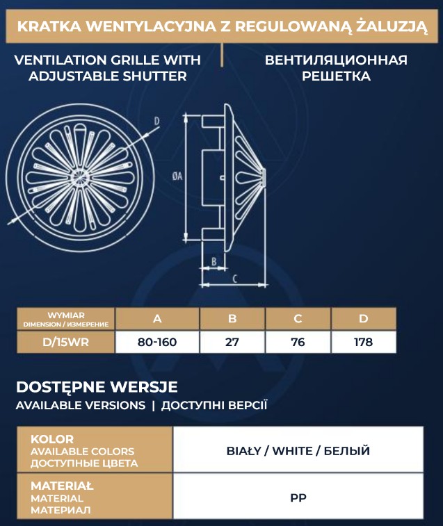 Innowacyjna kratka wentylacyjna z żaluzją. Wyróżnia się eleganckim wyglądem. Praktyczna i wygodna. Żaluzja mechaniczna jest otwierana i zamykana za pomocą dwóch sznurków. Bardzo lekko się ją reguluje. Kratka wentylacyjna zabezpiecza pomieszczenie przed zanieczyszczeniami, które mogłyby wydostać się z układu wentylacyjnego na zewnątrz. 50-letnie doświadczenie firmy DOSPEL w jej produkcji to gwarancja najwyższej jakości.